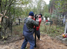 На данном участке изначально присутствовал только простой бетонный памятник и металлическое ограждение. Нам же необходимо было привести территорию могилы в полный порядок. Приступая к работе, мы первым делом вкручиваем определяющие фундамент сваи.