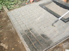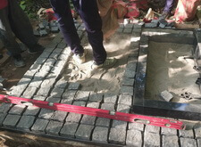 Засыпаем брусчатку пескобетоном, снимаем лишний слой, замываем.