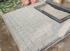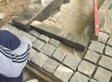 Начинаем укладывать брусчатку, параллельно монтируя цветник из гранитных балок. Кое-где целые квадратики не помещались, поэтому нам приходилось распиливать