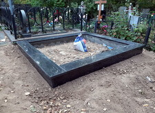 Когда подготовительные работы на территории могилы были завершены, мы принялись за укладку брусчатки на пескобетон, сама плитка была уложена вровень с облицованным гранитными плитами цоколем. Параллельно с этим мы подготовили основание для последующей установки надгробья.