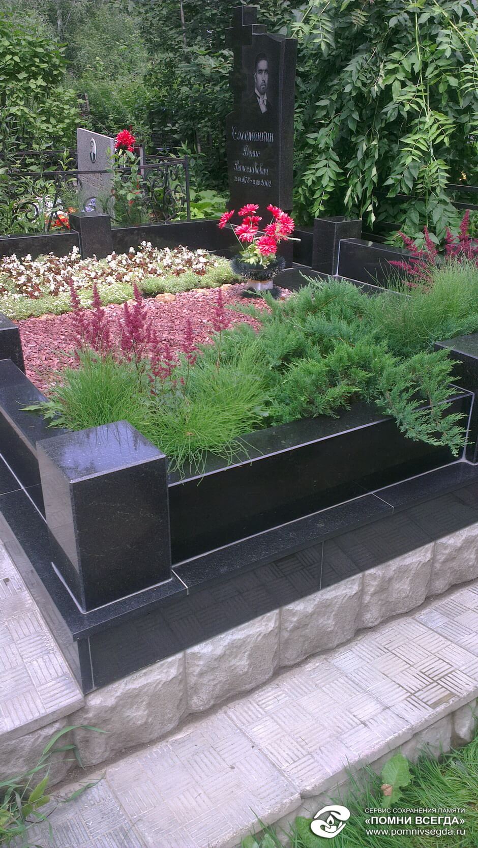 Гранит, крошку помыли. Цветник и можжевельники почистили от сорняков. Цветы и вечнозелёные полили. Могила в полном порядке.