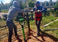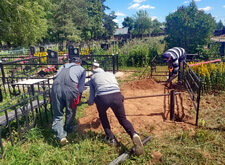 На каждом из четырёх углов вкручиваем сваи. Грунт на данной могиле попался твёрдый, после того, как сваи уже не вкручиваются, начинаем их забивать. Окончательно загнать сваи в землю так и не удалось, поэтому срезаем выступающие части. На качестве каркаса данное решение никак не отобразилось, так как длинна наших свай всегда несколько больше, чем требуется.