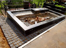 Приступаем к работе с цветниками. Один уже был в наличии, поэтому делаем второй, идентичный. По проекту цветники должны смотреться одинаково даже несмотря на то, что памятники будут разные. В это же время укладываем гранитную брусчатку уже на территорию места захоронения.
